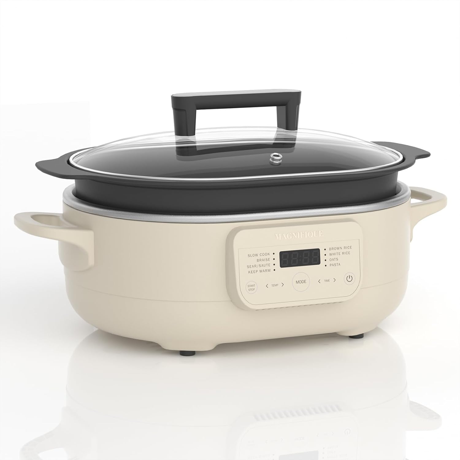 The MAGNIFIQUE 6 Quart Multi-Cooker is a versatile kitchen appliance designed to replace multiple cooking tools by offering eight preset functions: Slow Cook, Braise, Sear/Sauté, Keep Warm, Brown Rice, White Rice, Oats, and Pasta. Its nonstick pot is oven-safe up to 500°F, and omnidirectional heating ensures even cooking.
